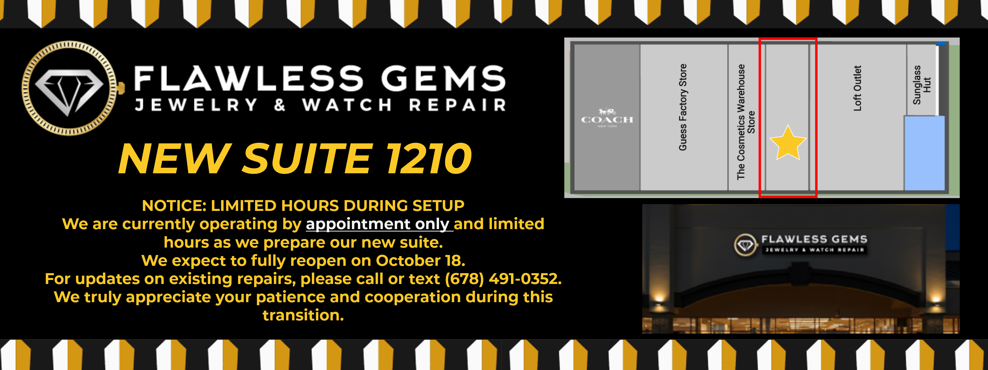 At Flawless Gems, every repair is handled by a trained bench jeweler with years of experience. We offer expert ring resizing, chain soldering, prong repair, stone replacement, and jewelry polishing & cleaning. All work is done in-house with the highest standards of care. Trusted jewelry repair near you at Tanger Outlets in Commerce, Georgia.